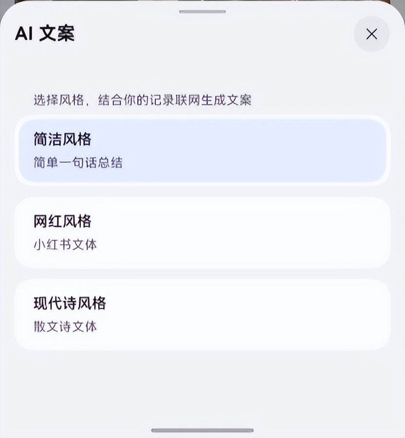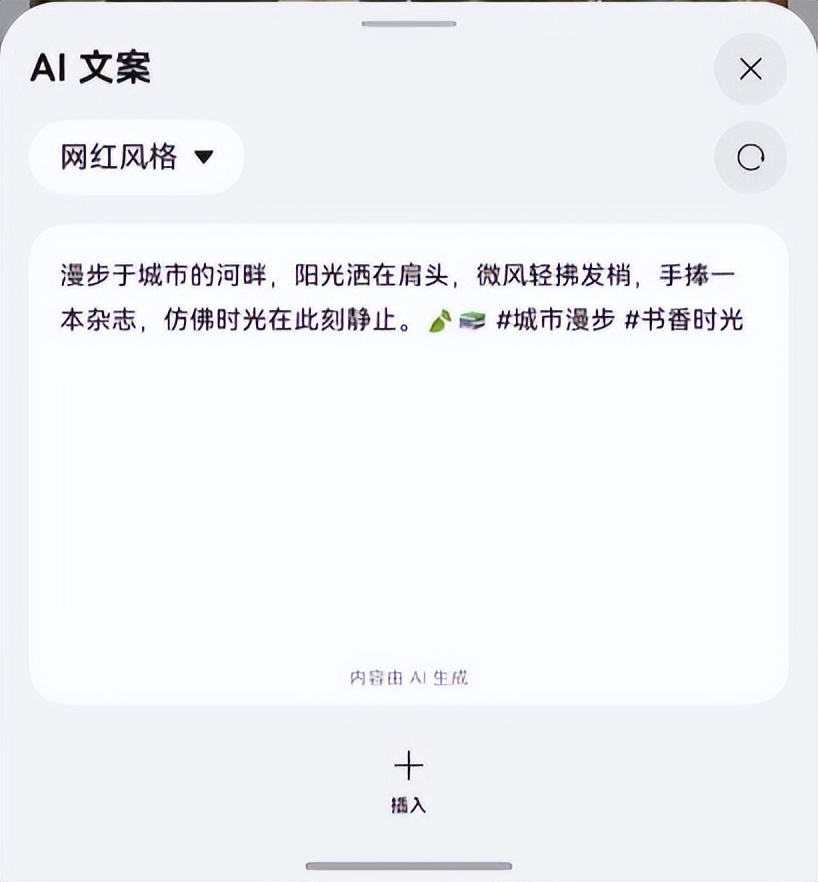 而且,小艺时光机还有AI文案功能,提供简洁、网红、现代诗三种风格。比如我这次国庆如果去城市citywalk,就可以用网红风格生成描述,“漫步于城市的河畔,阳光洒在肩头,微风轻拂发梢,手捧一本杂志,仿佛时光在此刻静止。”这样的文字,很贴合朋友圈分享的感觉!