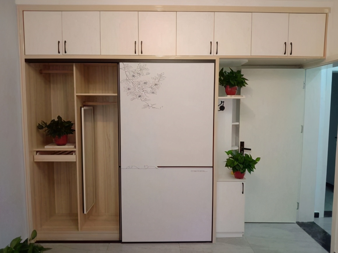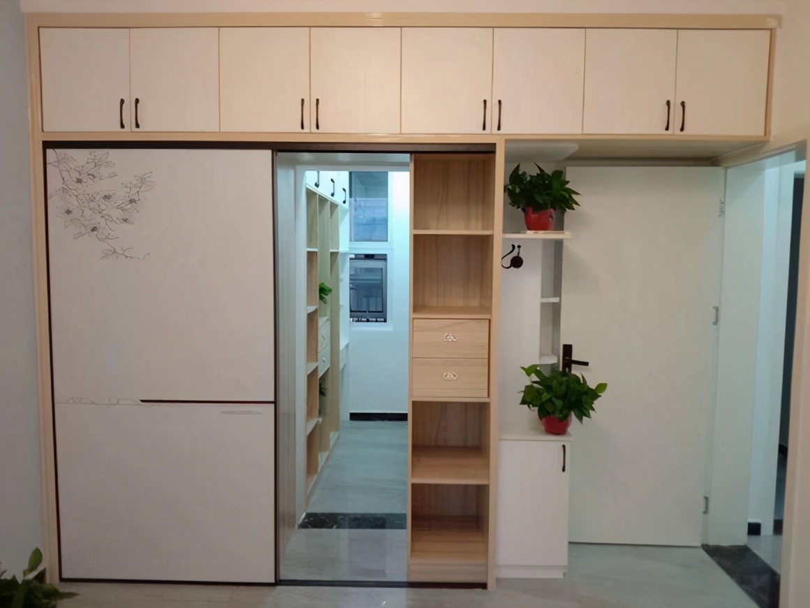 这是入户的玄关柜隔断设计,整个隔断空间可以作为鞋柜的收纳,满足一家三口的需求,入户进来不会直接看到整个客厅,所以玄关柜作为隔断的设计是非常明确的选择,而且也是让老木工打的,实用极了。还有衣钩的功能,展示柜的功能,这样的多功能柜实用极了。