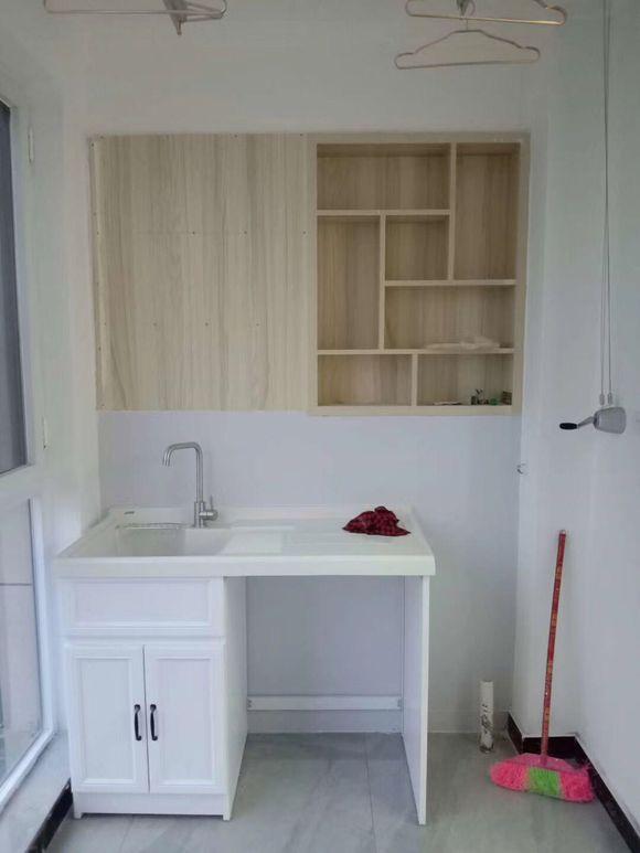 洗手台是买完了组装的材料,然后让老木工做的,尺寸和空间刚刚好,现在就差洗衣机放进来了。