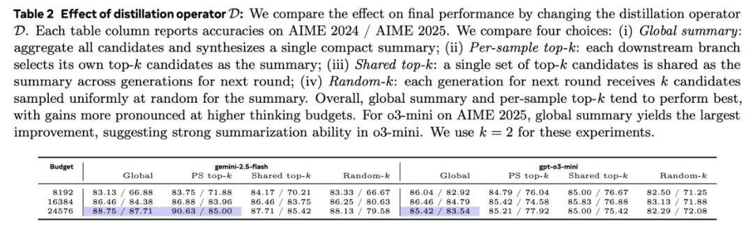 表 2 研究了在固定轮次(每轮生成次数为 g = [16, 8, 4])和每轮 k = 2 个候选的设置下,PDR 中的蒸馏操作符 D。