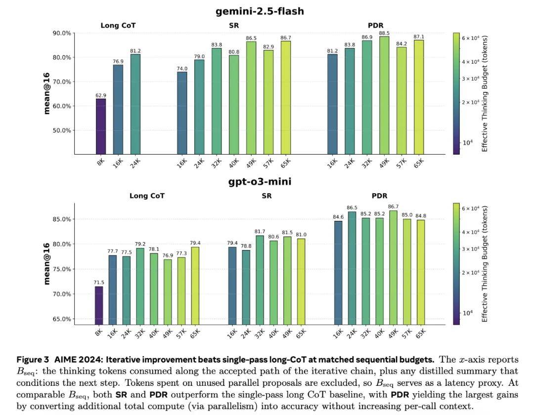 对于 o3-mini,在有效预算为 49k token、每次调用思维预算为 16k token 时,准确性从 76.9(长链推理)提升至 81.5(SR)和 86.7(PDR),相较长思维链,绝对值提升了 +9.8 个百分比。gemini-2.5-flash 从 SR 到 PDR 的变化小于 o3-mini,表明 gemini-2.5-flash 在自我验证方面更强。
