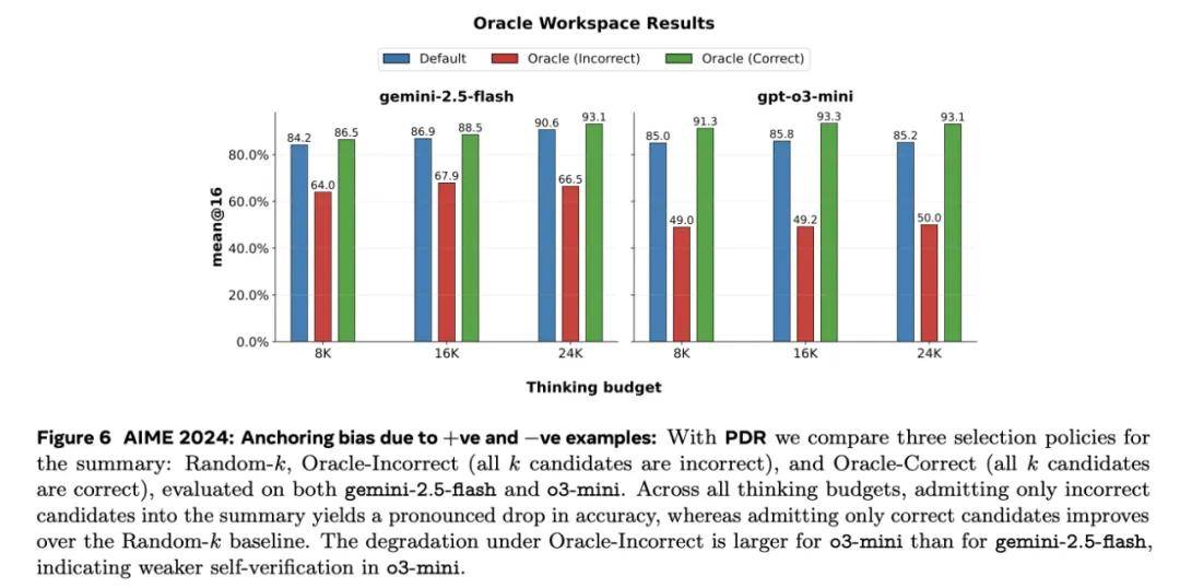 从图 6 和图 8 中,研究者观察到注入错误候选(Oracle (Incorrect))会导致所有模型的性能大幅下降。对于 o3-mini,性能下降显著大于 gemini-2.5-flash,这表明后者具有更强的自我验证和恢复能力。这一趋势在 AIME 2024 和 AIME 2025 中都得到了体现。