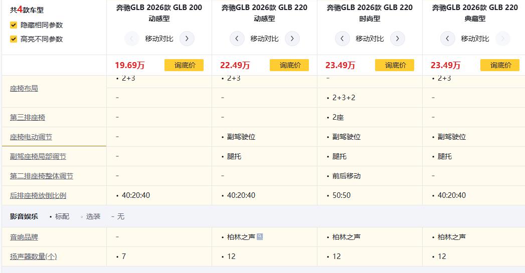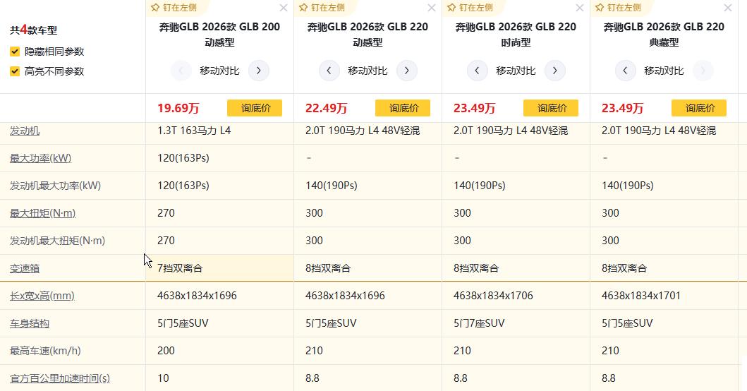 过年想冲豪华紧凑型SUV?这4款奔驰GLB怎么选开出去更有排面?奔驰GLB 2026款 GLB 200 动感型、奔驰GLB 2026款 GLB 220 动感型、奔驰GLB 2026款 GLB 220 时尚型、奔驰GLB 2026款 GLB 220 典藏型,纠结1.3T还是2.0T轻混?5座还是7座?配置差在哪值不值加价?今天一次性说透!