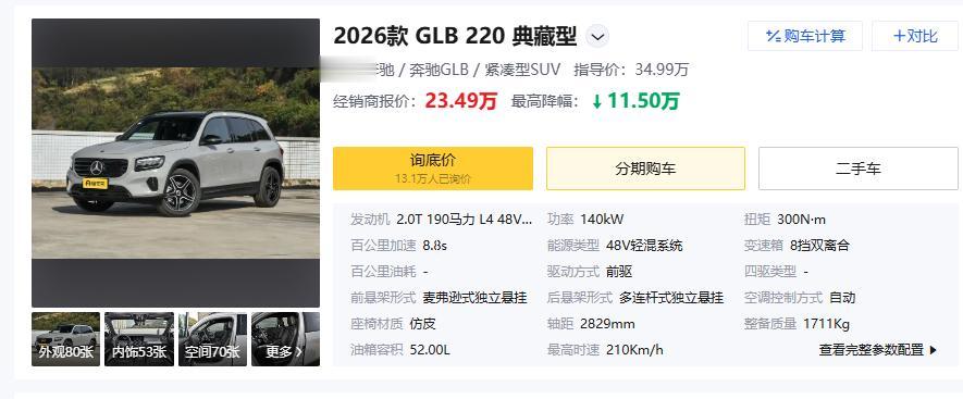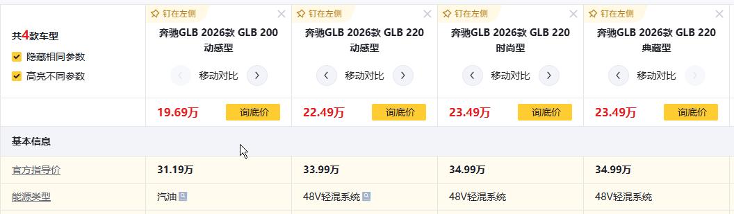 先说官方指导价:GLB 200动感型31.19万,GLB 220动感型33.99万(贵2.8万),220时尚型34.99万(比动感型贵1万,WLTC综合油耗7.02L/100km),220典藏型34.99万(和时尚型同价)。