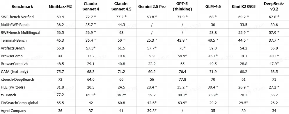 02基准测试概览MiniMax-M2 在一系列强调端到端编码和智能体工具使用的基准测试中表现优异。这些任务(如 SWE-bench, Terminal-Bench, BrowseComp, HLE (w/ tools), FinSearchComp-global 等)的性能与开发者在终端、IDE 和 CI 中的日常体验高度相关。
