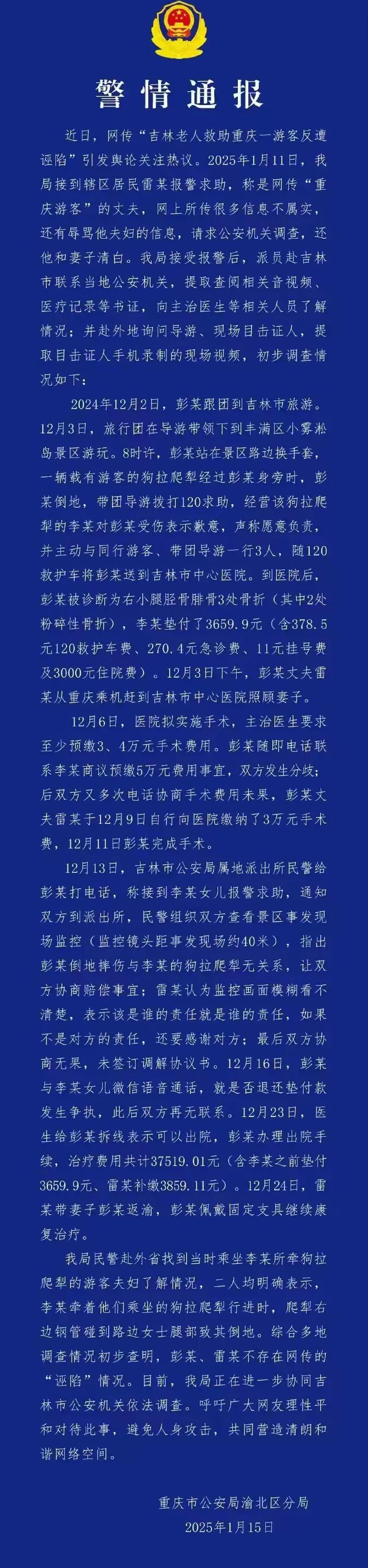 1月15日,重庆警方发布通报,对吉林大爷救助重庆女游客反被诬陷一事作出了详细描述。
