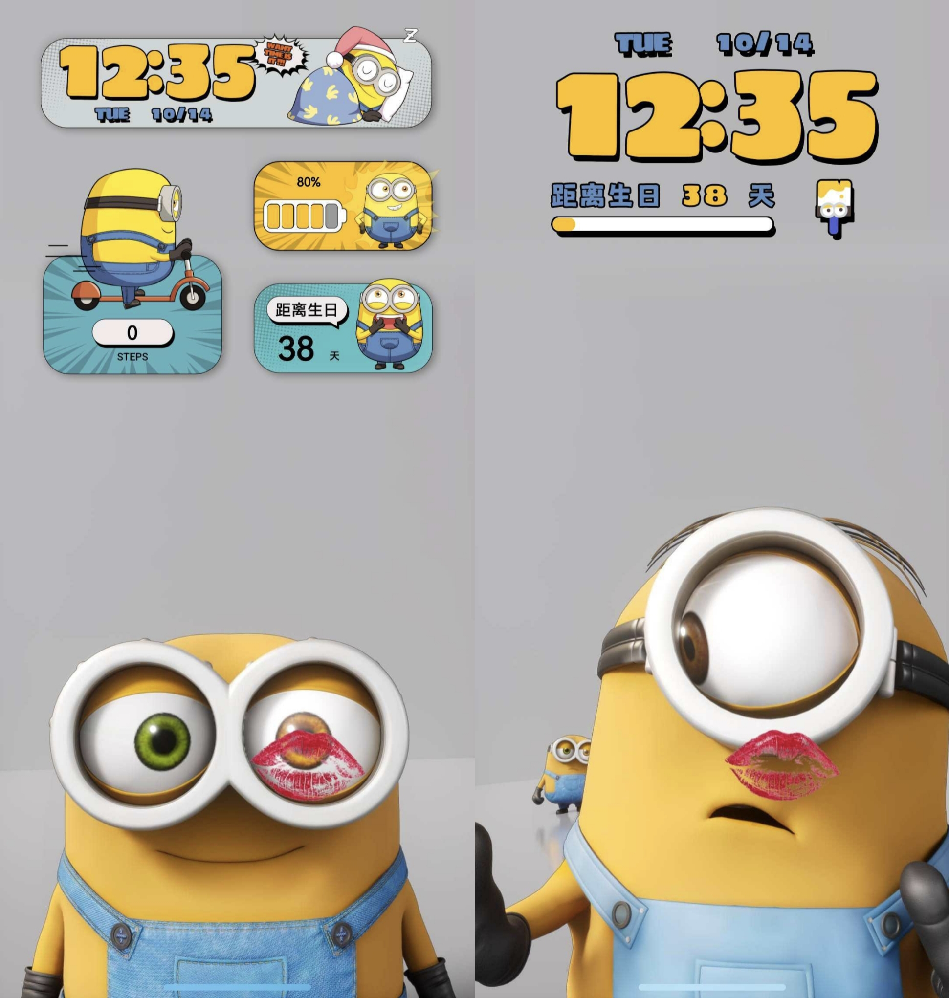 我趁机转移话题,开始积极展示我设置的手机桌面:“点两下能切换画面,点时间还能调动态,当然了,最好玩的就是你刚刚看到的切屏动画,全屏奶酪很震撼的~”我看他比较感兴趣,就顺水推舟继续聊起了他喜欢的小黄人,一搜还真有同款主题。刚下载好,点了下屏幕小黄人直接“啵”地送了个飞吻,我俩都被逗笑,刚才的尴尬一扫而光。