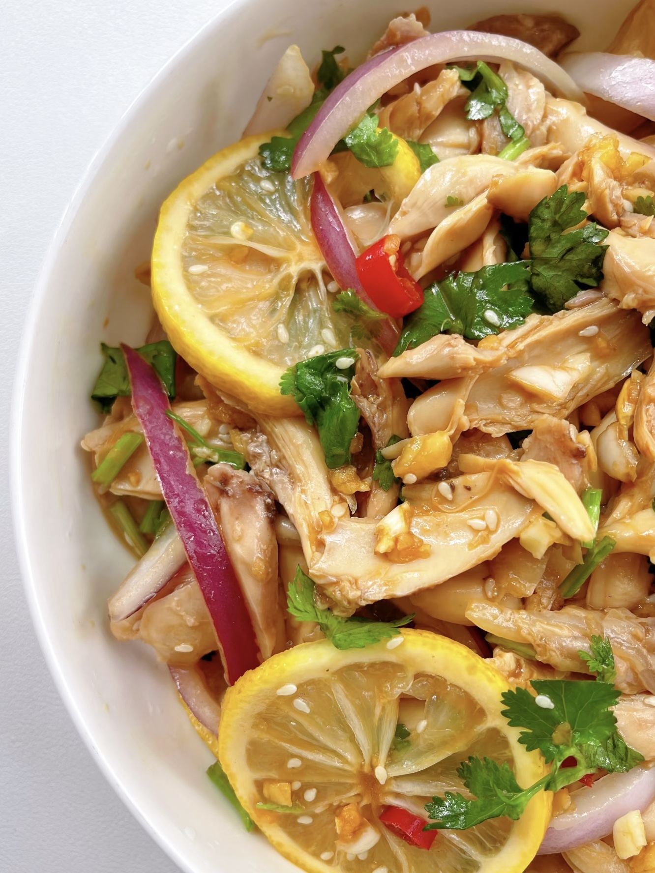 将调好的酱汁倒入装有鸡肉的碗中,再加入洋葱丝和柠檬片,用筷子将鸡肉和酱汁充分搅拌均匀,让每一条鸡肉都能裹上酱汁。最后,撒上一些白芝麻作为点缀,一道美味的柠檬手撕鸡就完成了。