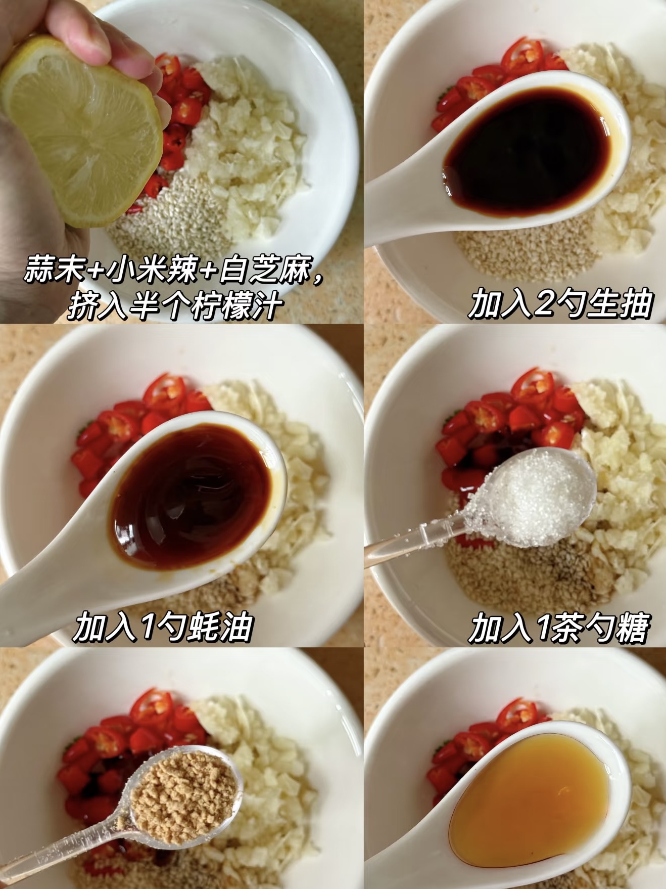 接下来,我们来调制酱汁。取一个小碗,加入蒜末、小米辣、白芝麻,然后挤入半个柠檬汁,这样可以增加菜肴的酸爽感。接着,加入两勺生抽、一勺蚝油、一茶匙糖和适量的盐,搅拌均匀。最后,撒上一些香菜段,增加香气。