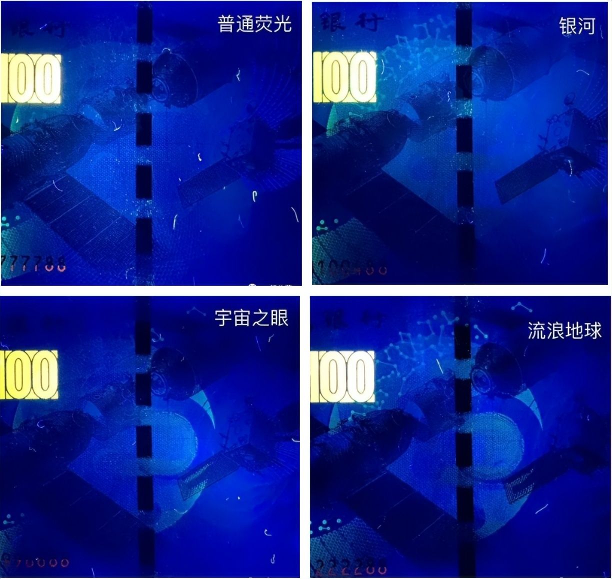 根据币面中间荧光的不同,航天钞可以粗略分为四种版别。