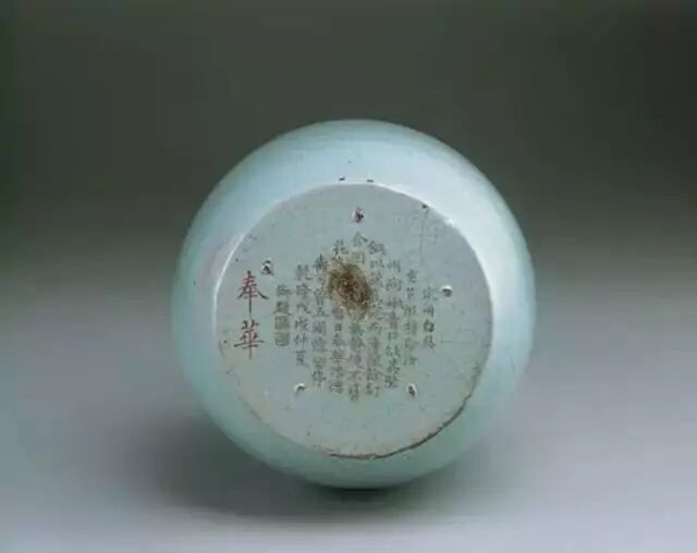 品名:北宋汝窑青瓷纸槌瓶尺寸:高20.5cm 深19.7cm 口径4.0cm 足径8.7cm典藏号:故瓷004371原收藏地:慈宁花园底部支钉:5枚传记:圆口、口沿磨平,长颈、折肩、直腹、平底,底部有五点支钉痕,并刻有乾隆丙申年(1776)御题。由题诗中“缘铜试看守口器”一句,配合器物口沿处痕迹来看,可以推测这件纸槌瓶和“奉华”款纸槌瓶一样,原本应也镶有铜扣,而且这些铜扣应该是早在乾隆御题前就镶上了。御制诗:缘铜试看守口器,书座堪思防意城。簪朵雅宜名意蕊,称怀已自息心旌。足钉薜暴诚何碍,,以微瑕弃美琼。台北故宫馆藏21件汝窑完整介绍之十汝窑青瓷碟▼