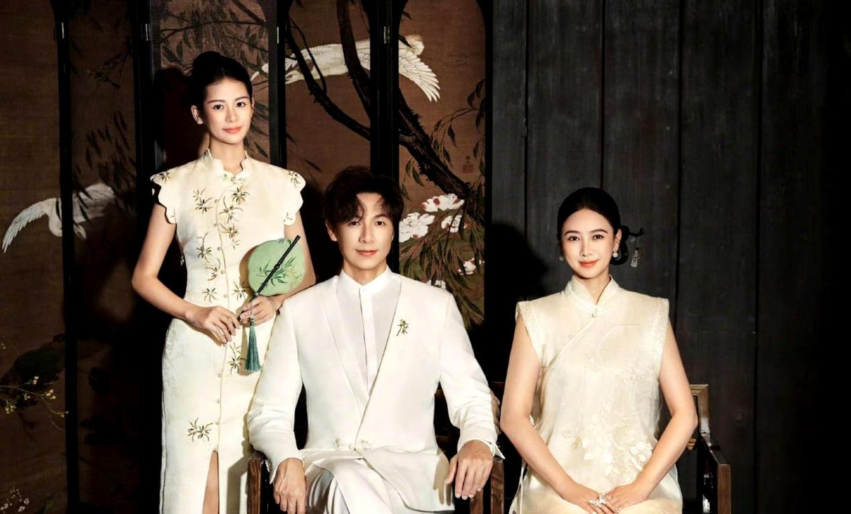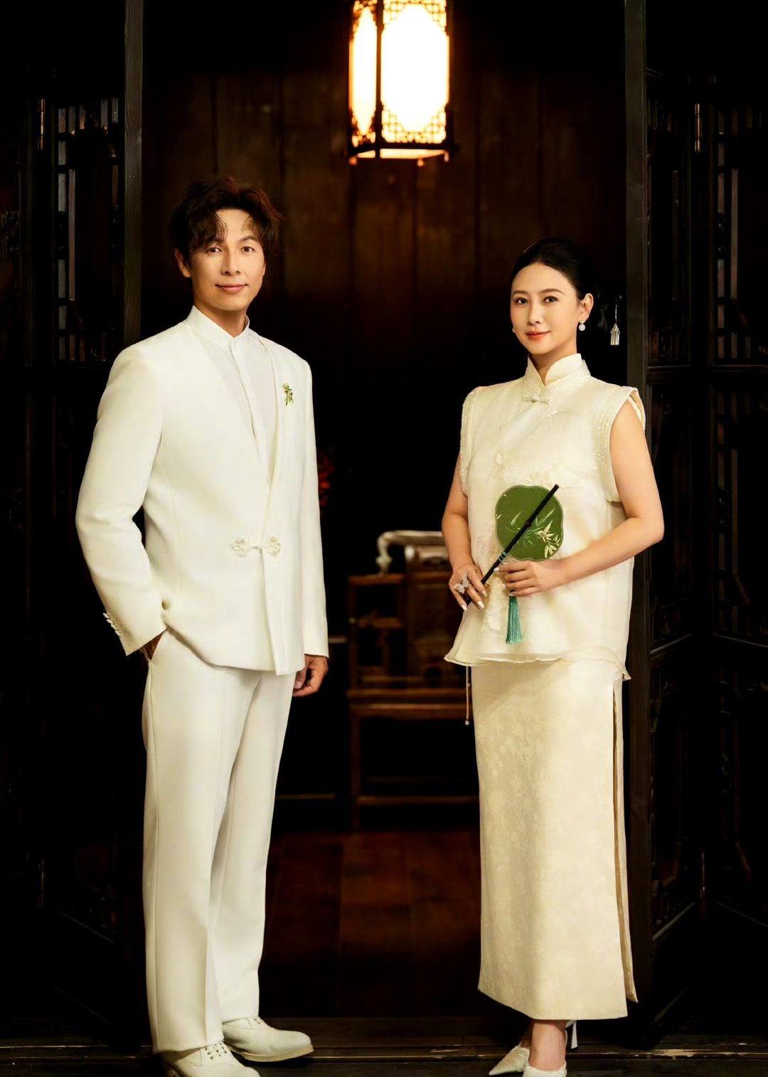 翁虹的丈夫则是一套新中式西装配白色皮鞋,发型更显韩范,温润中带着几分书卷气。