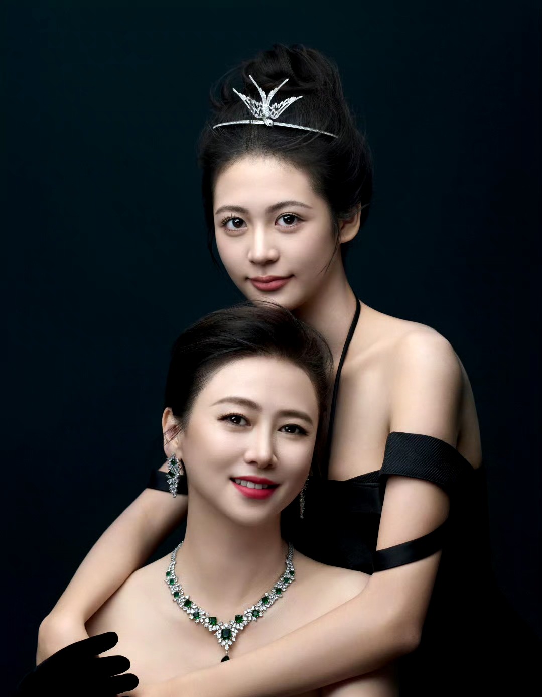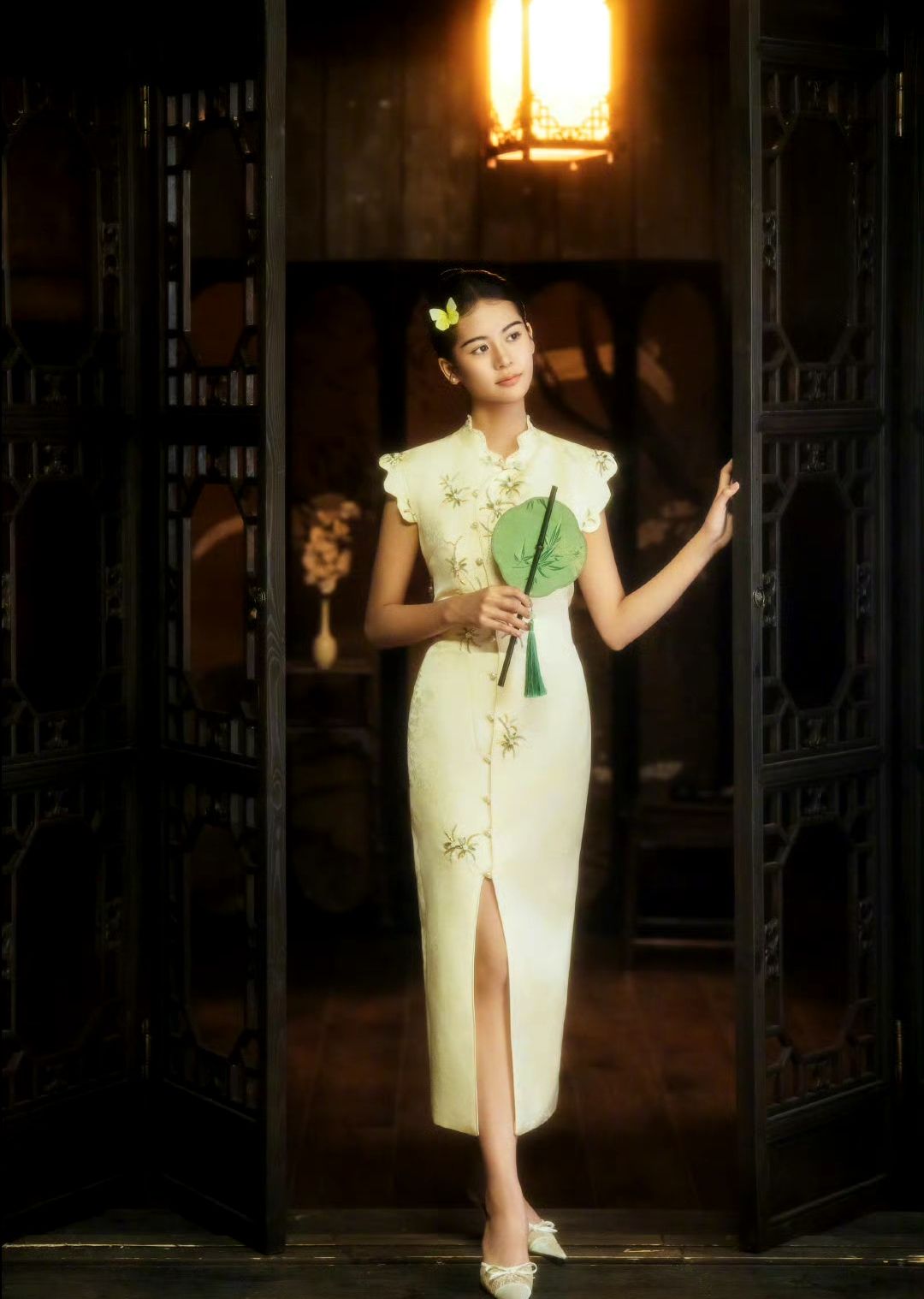 女儿水晶选择了一套色系与父母衣服相近的嫩黄色花边旗袍,款式婉约又带着几分小性感,配上白色高跟鞋,与翁虹同款的团扇和发型,发间别一朵黄色蝴蝶,轻盈又甜美。