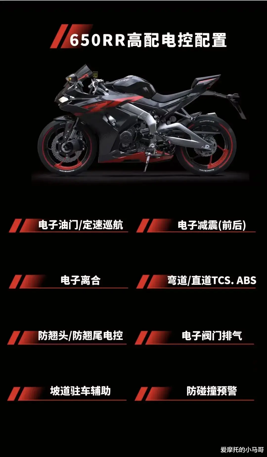 说完动力和车重,咱再看看这凯越650RR的配置,只能说凯越这次真的是下血本了。电子油门、定速巡航都安排上了,有了定速巡航,跑长途的时候手腕子再也不用累得生疼了。高级电子减震加上过弯防滑系统,就算是下雨天、下雪天,骑车心里也不慌。还有防抬头、防甩尾功能,新手想试试弹射起步,它也能帮你稳稳地兜着底。电子排气阀门更是一绝,平时在市区里低调溜街,声音小小的,不扰民;要是想去赛道撒欢儿,一键就能切换到“咆哮模式”,那声浪,绝对能点燃你的激情。另外,它还有坡道驻车辅助,堵车在坡道上的时候,再也不怕溜车了;防碰撞预警功能,能提前提醒你路上的危险,安全感直接拉满。