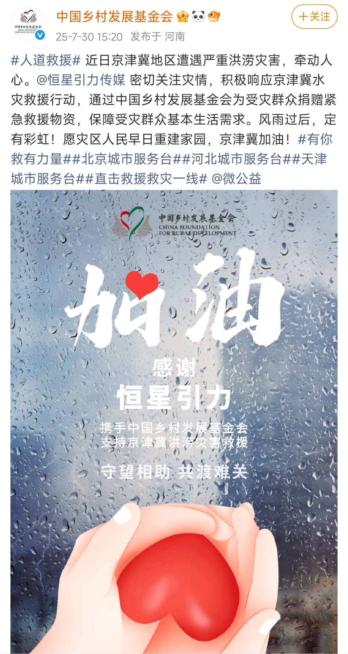 近日,京津冀地区遭遇历史罕见的洪涝灾害,多地出现严重内涝、房屋损毁和基础设施瘫痪,给当地居民的生命财产安全带来巨大威胁。在这种危急时刻,上海恒星引力文化科技有限公司通过“中国乡村发展基金会”向受灾地区捐赠紧急救援物资,以实际行动支持灾区群众渡过难关,引发了不少网友的热议、点赞。