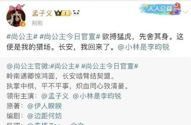 《尚公主》正式官宣,孟子义饰演丹阳公主暮晚摇(一番),李昀锐饰演寒门宰相言尚(二番),延续《九重紫》番位格局。