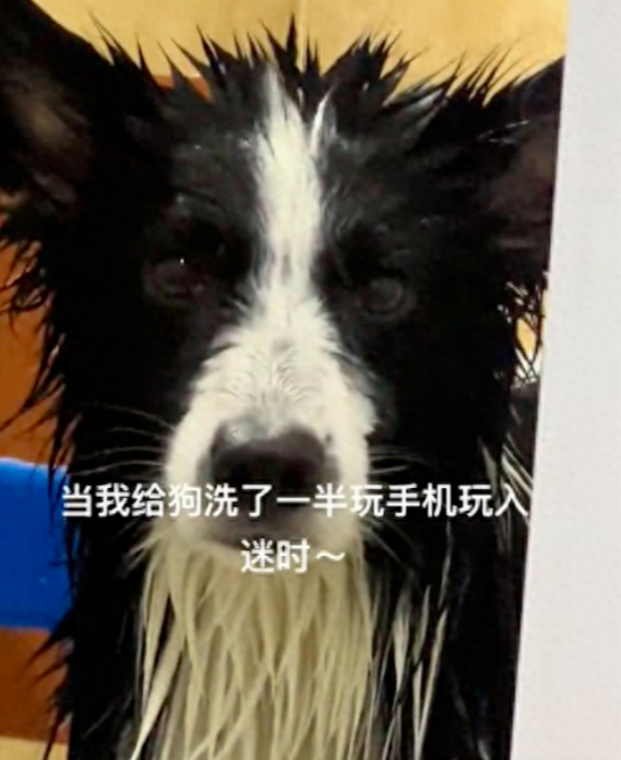 更绝的是,这狗可太乖了。主人不来,它也不叫唤,就站在门口看着主人玩手机。画面感很强啊:一边是玩得不亦乐乎的主人,一边是湿漉漉站在那儿的狗。这狗怕不是个隐形人吧?