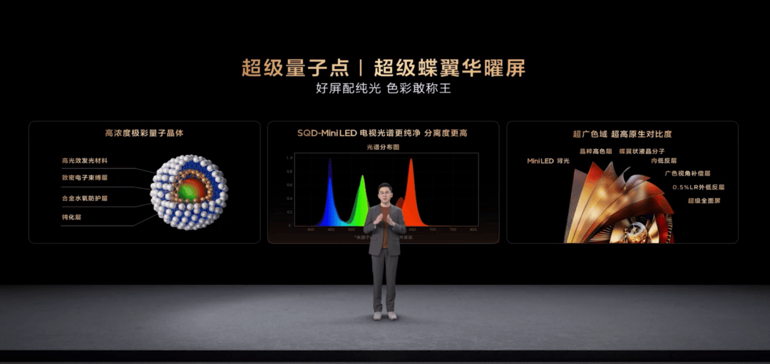 这种稳定性的背后,是Super QD(超级量子点)材料学的突破,其量子点晶体粒径更准,粒径更统一,红、绿、蓝三原色光更纯净。