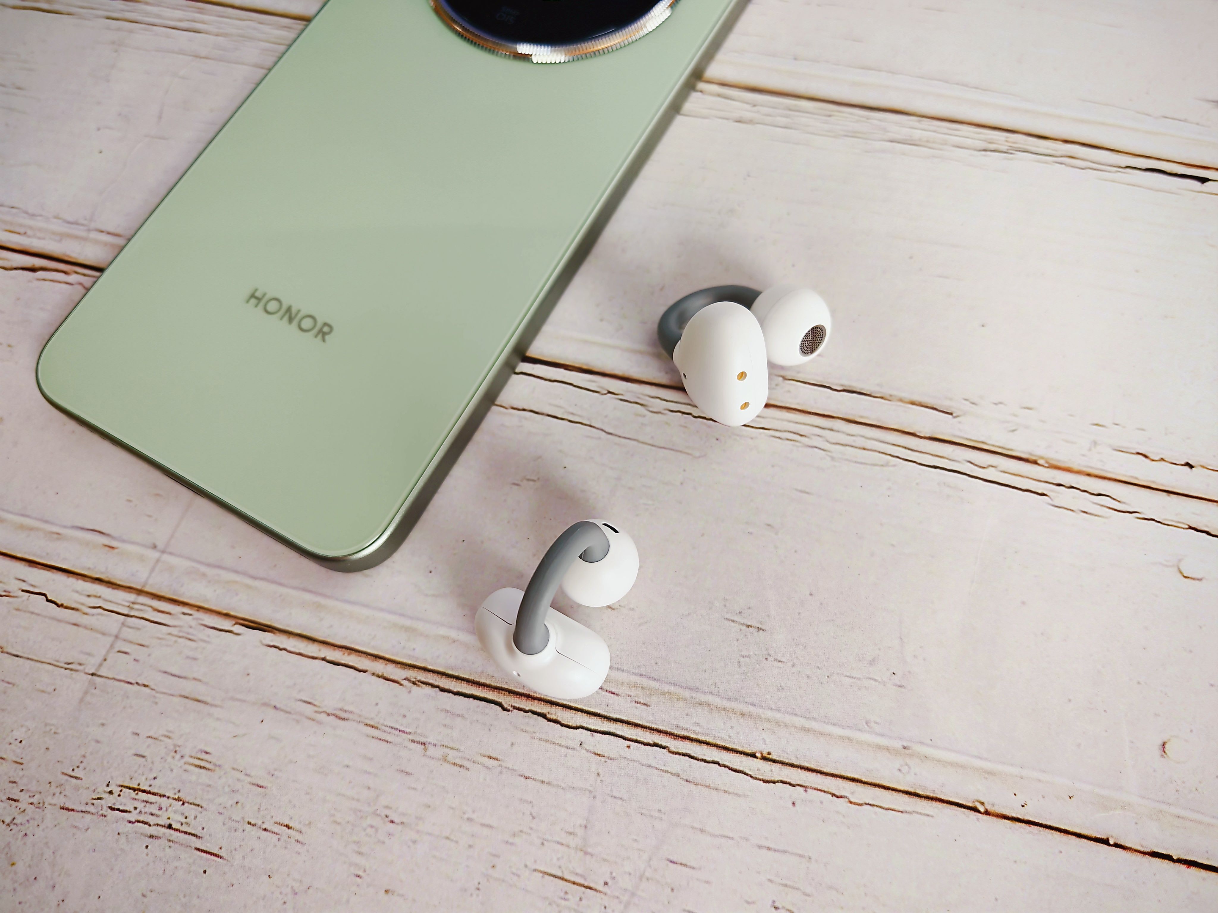 双耳机采用了∠12°弧面设计,表面是亲肤硅胶材质,摸起来就像第二层皮肤一样柔软。电池仓的弧面完美契合耳背曲线,用手按压,能感受到它柔软的回弹力。