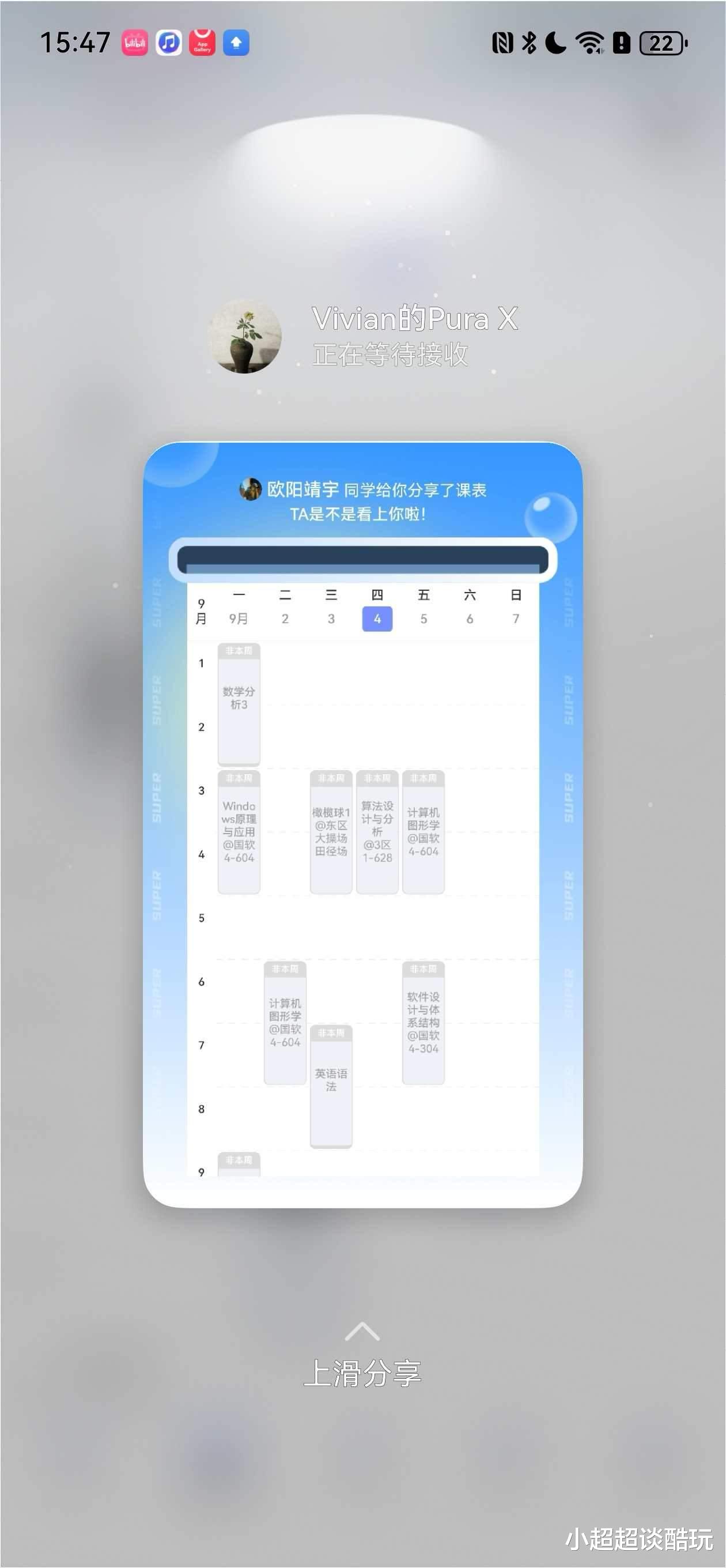 大学生活和高中的最大不同,就是课程安排完全不固定。刚开学时,我常常被时间和地点搞得晕头转向。室友推荐的“超级课程表”App,在鸿蒙系统上简直成了我的救星。我把课表“变成”小卡片放在桌面上,随看随用,也不用总是打开app去查看课表,省去了打开-查看的流程,更酷的是,它还有一个社交“小心机”——和同学“碰一碰”手机就能轻松分享课表,这个功能真的太懂大学生的需求了。
