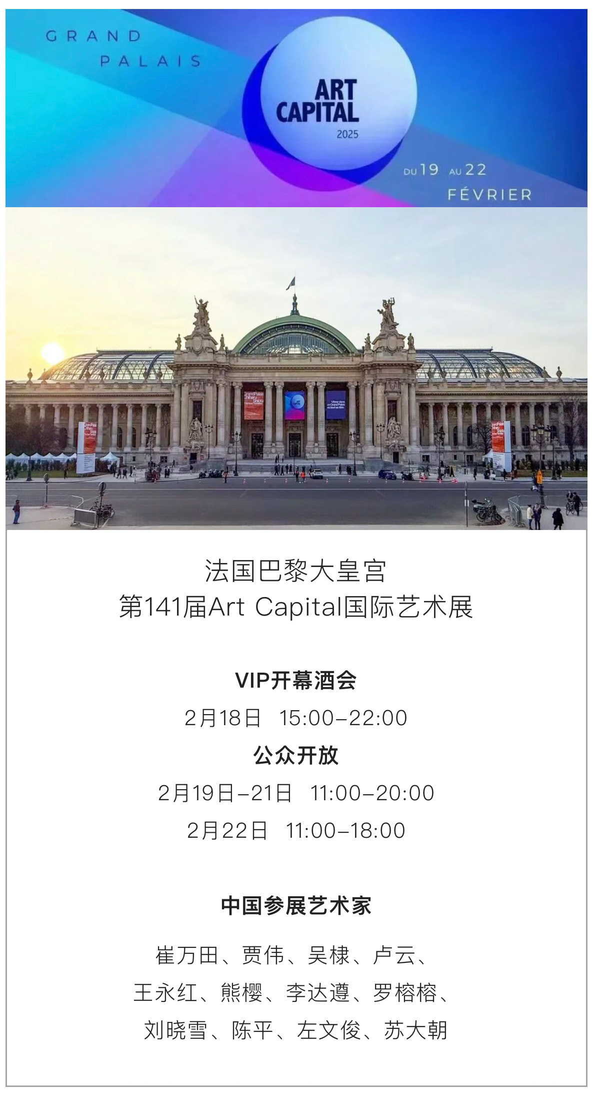 2025年2月18日,全球艺术界翘首以盼的第141届Art Capital巴黎大皇宫国际艺术展在焕然一新的巴黎大皇宫盛大开幕。这场由法国政府文化部、法国国家博物馆与巴黎大皇宫联合主办的艺术盛会,不仅标志着这座百年艺术殿堂的荣耀重生,更以跨越时空的创造力为世界献上一场视觉与精神的盛宴。