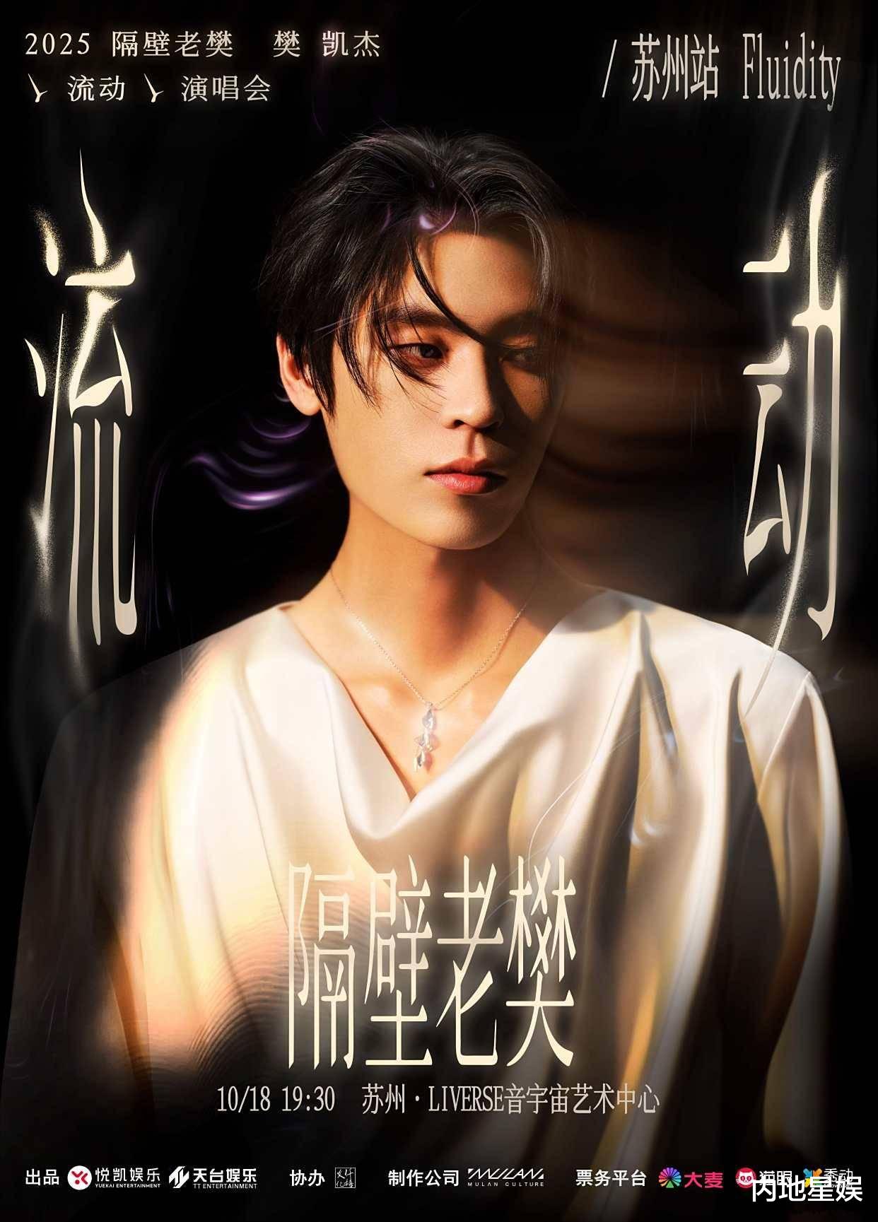 隔壁老樊_樊凯杰"流动"演唱会苏州站门票预售已开启。10月18日19:30,以"水韵古城"闻名天下的苏州将迎来一场音乐盛宴——苏州市LIVERSE音宇宙(音宇宙艺术中心)将化身为沉浸式音乐殿堂。当樊凯杰极具感染力的音乐遇上苏州独特的江南水乡风情,必将擦出令人惊艳的艺术火花。令人期待满满!回顾9月20日北京站的精彩现场,樊凯杰用20首跨越时光的经典与新作,为观众献上了一场关于音乐与时间的深情对话。从《我曾》的低吟浅唱到《都会变好的》的治愈之力,《多想在平庸的生活拥抱你》的温柔诉说到《我要带你去流浪》的全场大合唱......他以极具故事感的嗓音和匠心独运的舞美设计,打造出一个充满呼吸感的沉浸式音乐空间,让每一位观众都沉浸在音乐最本真的感动之中。