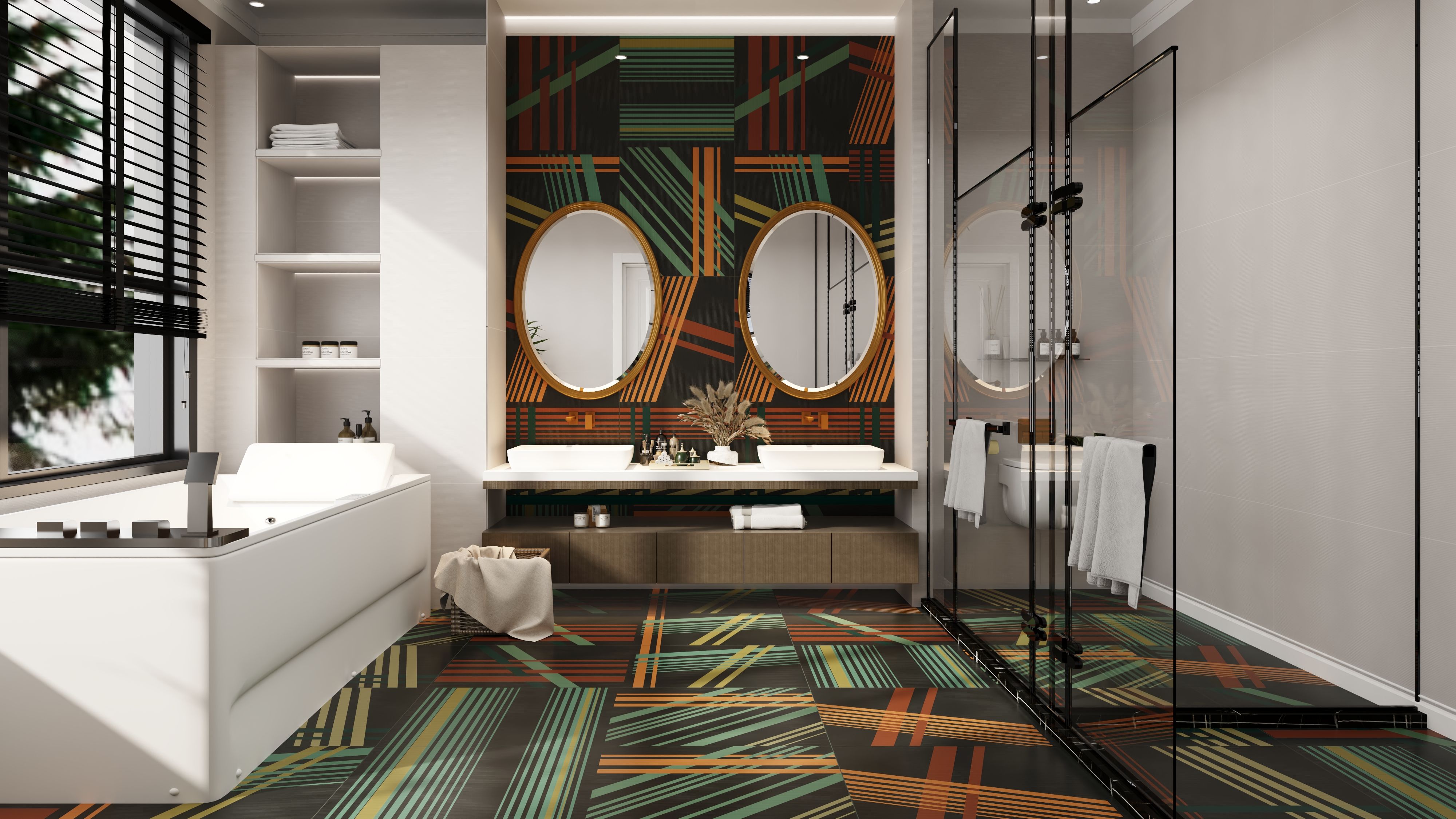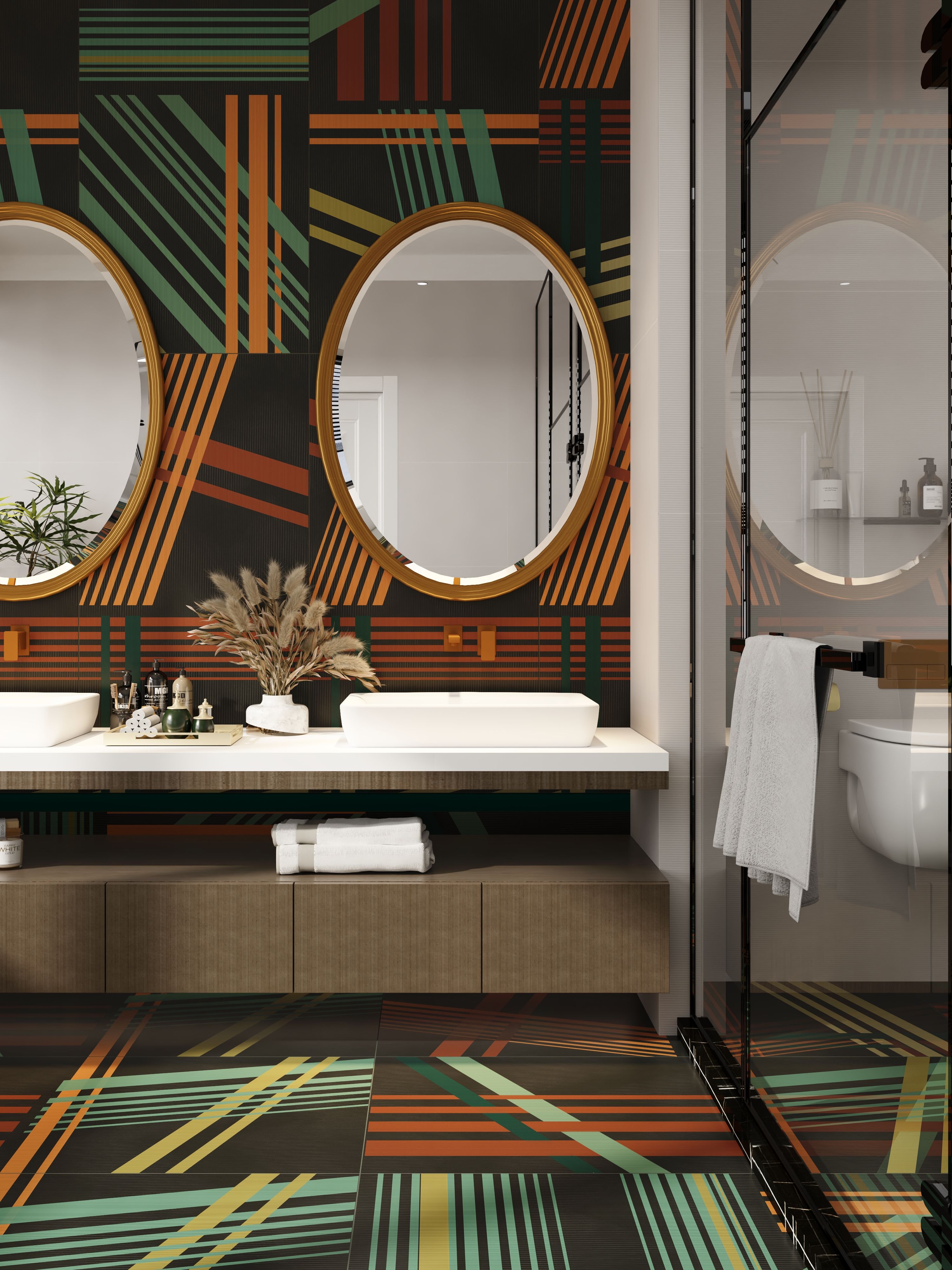 风格塑造,定义个性空间 在整体风格打造上,国际瓷砖品牌伊莉莎白瓷砖的艺术感为浴室奠定了个性基调。搭配金色边框的圆形镜子,复古又精致,与国际瓷砖品牌伊莉莎白瓷砖的色彩线条相互呼应,进一步强化了空间的艺术氛围;白色的卫浴洁具,在色彩丰富的瓷砖衬托下,显得格外干净利落,平衡了视觉上的丰富感,让整个浴室既有艺术的张扬,又有生活的清新。 一块瓷砖,能做的远不止 “铺地贴墙”。