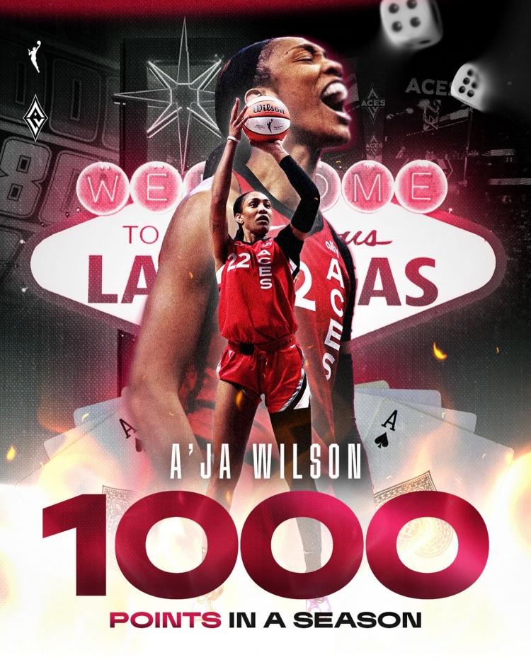拉斯维加斯王牌的阿贾-威尔逊在对阵康涅狄格太阳的比赛中,砍下29分9篮板3助攻,本赛季总得分达到1000分,成为WNBA历史上首位单赛季得分破千的球员,继续刷新历史纪录。