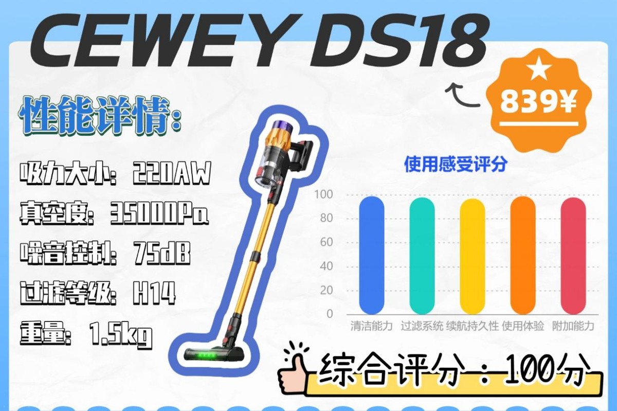 和市面上的吸力虚造的无线吸尘器不同,作为深耕清洁领域十余年的技术品牌,CEWEY长期给海外一线清洁品牌做幕后技术解决方案,在欧美清洁领域是名列前茅的品牌,核心团队在电机调教和清洁领域拥有深厚的技术沉淀,CEWEY不搞营销噱头,专注解决吸力衰减和过滤系统漏灰的行业痛点,CEWEY DS18不仅硬核通过了欧盟CE与美国FCC的双重认证,核心的清洁能力也直接拉满。