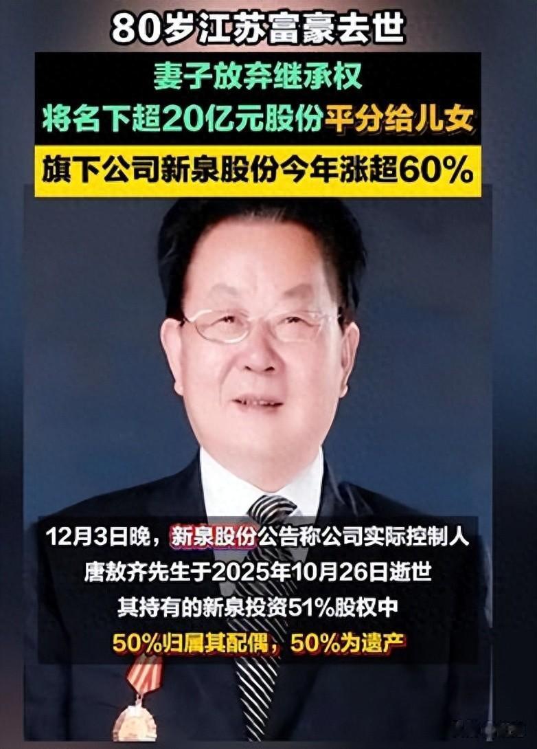 80岁富豪病逝,老伴放弃超20亿元股权及不动产 继承全予子女