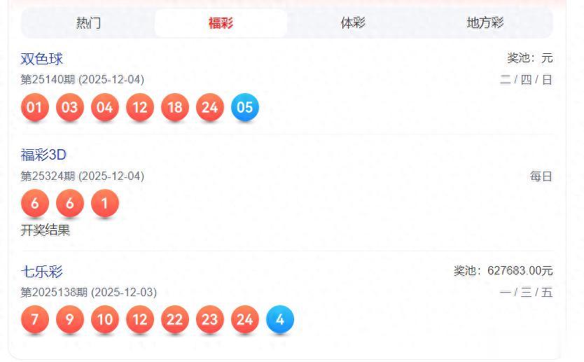 12月4日福彩开奖结果新鲜出炉!双色球25140期虽头奖空缺,但26.55亿奖池持续高位,红球三区分布均衡暗藏规律;福彩3D开出“661”组三号码,为彩市注入新热度。