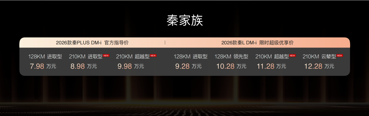 此次,2026款秦PLUS DM-i三款车型售价7.98万元-9.98万元;2026秦L DM-i四款车型限时超级优享价9.28万元-12.28万元;2026款宋Pro DM-i限时超级优享价9.98万元-12.78万元。