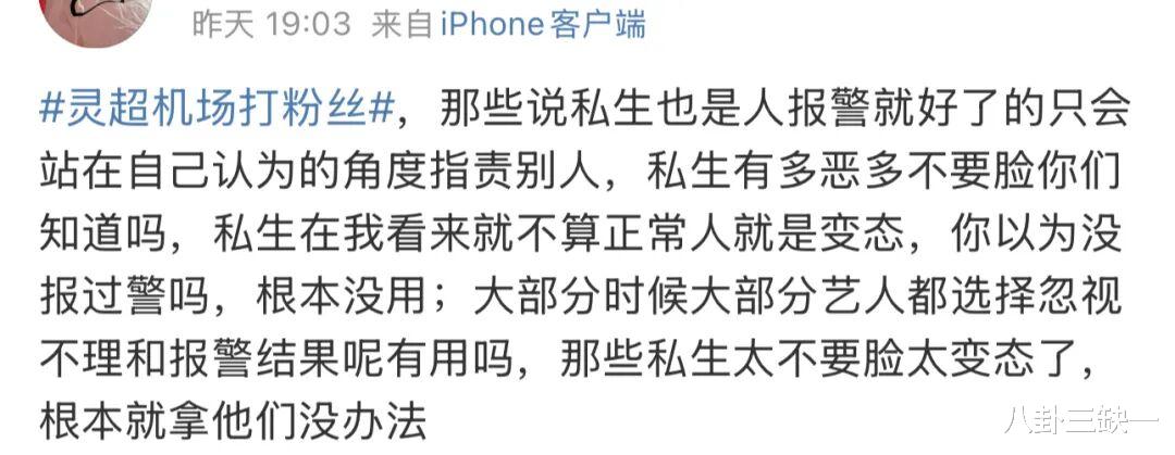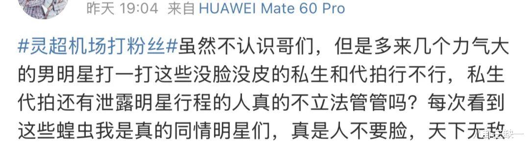 不少路人火速转变立场,觉得这事儿怪不得灵超,我们当然不提倡用暴力解决问题,可把人逼到这份上还有什么更好的解决办法吗?报警不行,私生的跟拍、蹲守往往游走在法律灰色地带,取证难、处罚轻,往往是批评教育后不了了之,转头她们就能换个地方继续蹲点;