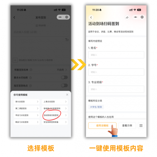 点击发起签到,有丰富的签到模板可用,适用于活动到场扫码签到、上课签到、二课签到/签退等;一键使用模板,简单修改即可发布。