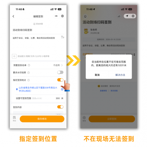 30秒快速发起,可实现到场扫码签到,智能防作弊更高效~