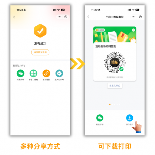 签到接龙可生成二维码海报,打印下来将二维码张贴在活动现场,同学们到场后扫码参与,3秒即可轻松完成签到。