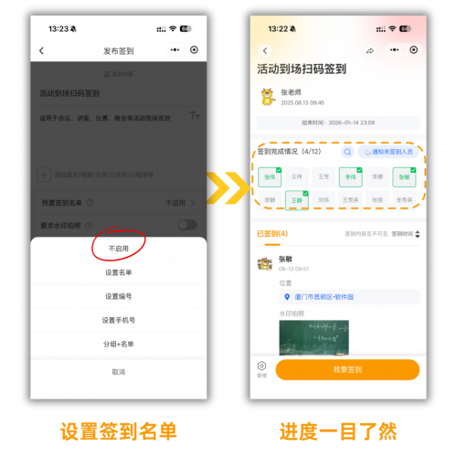 参与人点击名单中自己的姓名即可完成签到,签到后名单自动点亮,谁来了谁还没来一目了然;且每个人只能签到一次,有效防止代签到。