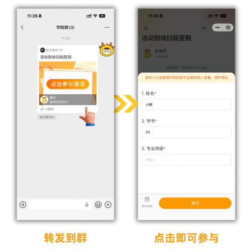 还可将链接转发到班级群、学院群等,同学们点击链接即可打开接龙,参与签到。