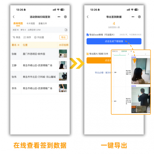 相对于传统签到要耗费好几个小时统计签到/签退数据,接龙管家的一键导出数据功能更加智能高效。