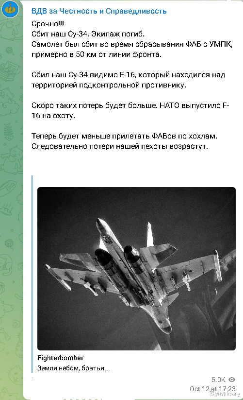 随后,另外一名俄罗斯博主“诚实与正义空降部队”(ВДВ за Честность и Справедливость)也发文称:“紧迫!我们的苏-34被击落了,飞行员牺牲。这架苏-34是在距离前线约50公里投掷配备UMPK的FAB航空炸弹时被击落。很显然,这架苏-34是被敌方控制区上空的一架F-16战斗机击落的。很快还会有更多这样的损失,北约已经派出F16进行狩猎。现在乌克兰人需要面对的FAB航空炸弹将会减少,这样一来,我们的步兵损失将会增加”。