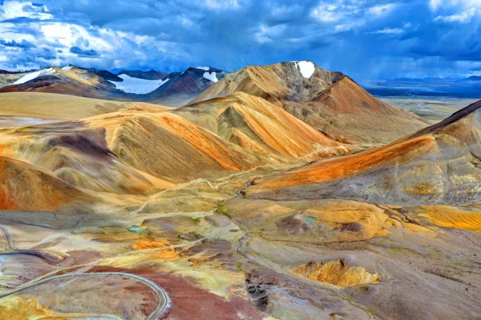 从空中俯瞰,这片丹霞如同大地的血脉,赭红、暗紫、铁灰、明黄层层叠叠,在高原刺眼的阳光下呈现出惊心动魄的色泽。山脉的褶皱被风雨切割成无数尖锐的棱角,却又在远处融化成柔和的波浪。那些深浅不一的红色条纹,像是远古巨人用沾满矿物的画笔,在岩壁上随意挥洒的抽象画作。