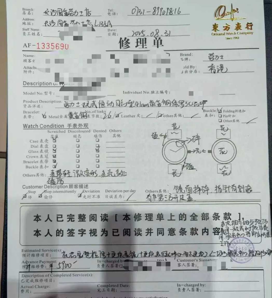 今年8月,匡先生将不慎摔碎镜面的劳力士腕表送至长沙IFS国金中心劳力士门店。初步检测时,门店工作人员预估维修费用约5900元。然而当手表送至北京售后服务中心后,维修方案却发生突变:除了更换镜面,还必须同时更换价值7300元的主夹板,总费用飙升至12300元。