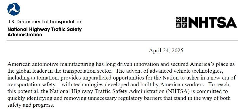 第一,监管放松。2025年4月,美国公路交通安全管理局(NHTSA)宣布放宽安全要求,精简事故报告流程,并扩大“自动驾驶车辆豁免计划”适用范围,为特斯拉取消方向盘和踏板的Cybercab车型扫清了制度障碍。