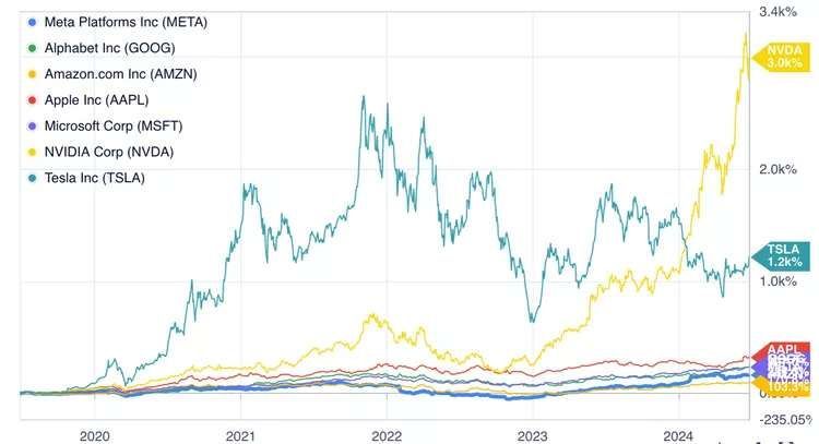 美股7姐妹卷土重来当标普500指数艰难爬升时,由微软、苹果、英伟达、亚马逊、Alphabet(谷歌母公司)、Meta(Facebook母公司)和特斯拉构成的“七姐妹”早已突破历史峰值。这七大科技巨头今年贡献了标普500近110%的涨幅,其总市值已超过全球除美国外所有上市公司的总和。