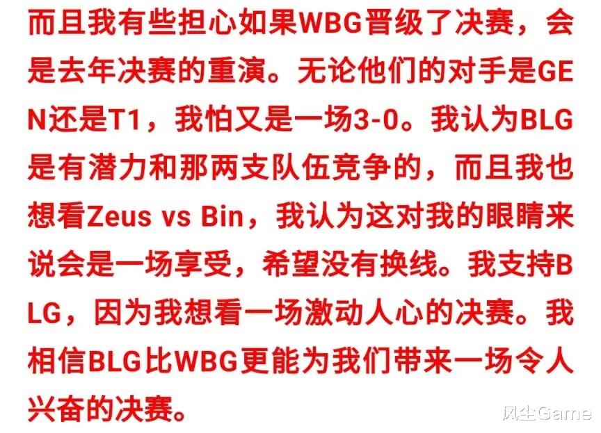 其实这也是LPL观众们,比较担心的局面,要是WBG真打进决赛了,又在决赛里拉胯,那LPL明年的热度,估计又会遭到冲击,不过两队硬实力,其实是有一些差距的,但关键点在于,两队的辅助选手,谁能保持正常的发挥,毕竟瑞士轮的时候,ON和刘青松,冥场面是一个比一个多的。