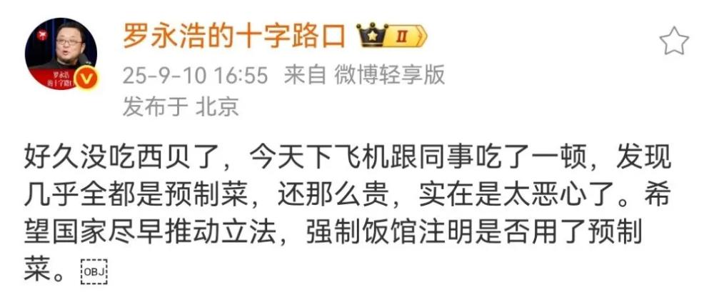 2025年9月10日,罗永浩一条“西贝全是预制菜还贵”的微博如平地惊雷,12小时内引爆3.2亿次阅读。面对汹涌舆情,西贝客服先以“牛大骨现煮、莜面手搓”为由否认预制菜争议,次日创始人贾国龙更放出“起诉罗永浩”的强硬表态,将事件推向“品牌对抗消费者”的舆论漩涡。