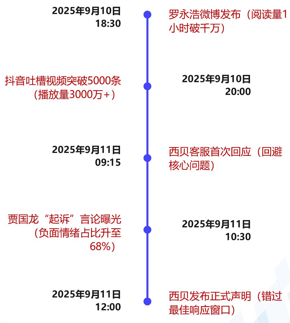 西贝在舆情响应上暴露严重的监测盲区。罗永浩微博发布于9月10日18:30,而西贝首份正式声明迟至9月11日12:00发布,间隔17.5小时,错过短视频平台的黄金扩散期。数据显示,事件发酵6小时后,抖音相关吐槽视频播放量已破亿,形成“平台联动-二次创作-媒体跟进”的传播闭环,此时西贝仍未启动正面回应机制。
