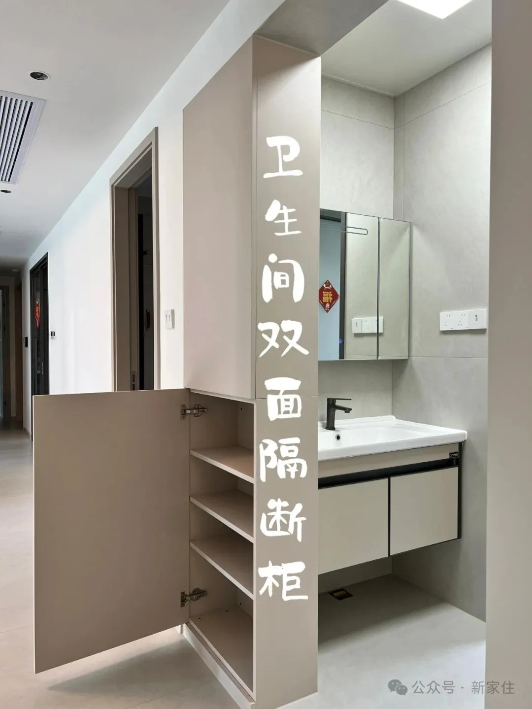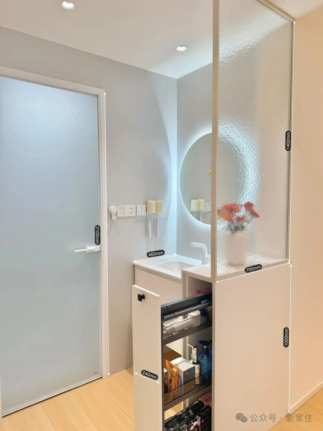现在很多人都喜欢,卫生间干区做半墙,不仅视线通透,还美观,但是这个半墙可以用柜子代替。