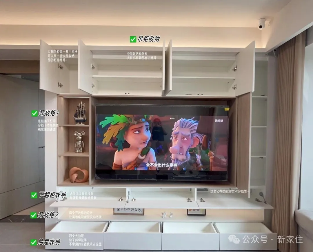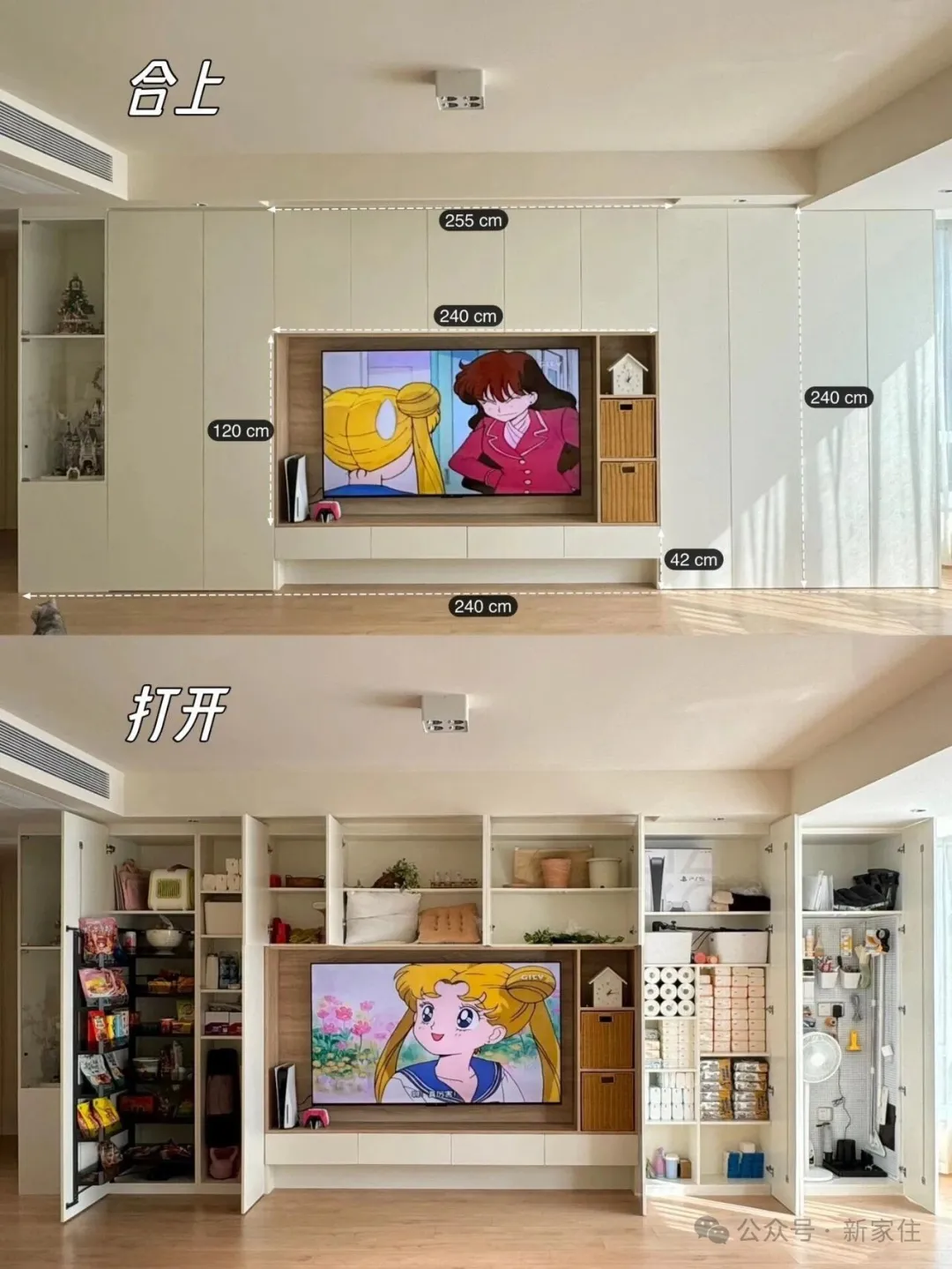这一次新房装修,纠结很久,最终做了满墙的电视柜。柜子没有太厚,但是分区合理,放的东西很多。购物节囤的卫生纸、洗化用品、小工具、孩子的玩具等,大大小小的杂物都能塞进去,柜门一关,整面背景墙干净整洁。用无拉手的设计,再搭配个电视机前伸缩支架,内凹电视和柜子做平,别提多好看了!