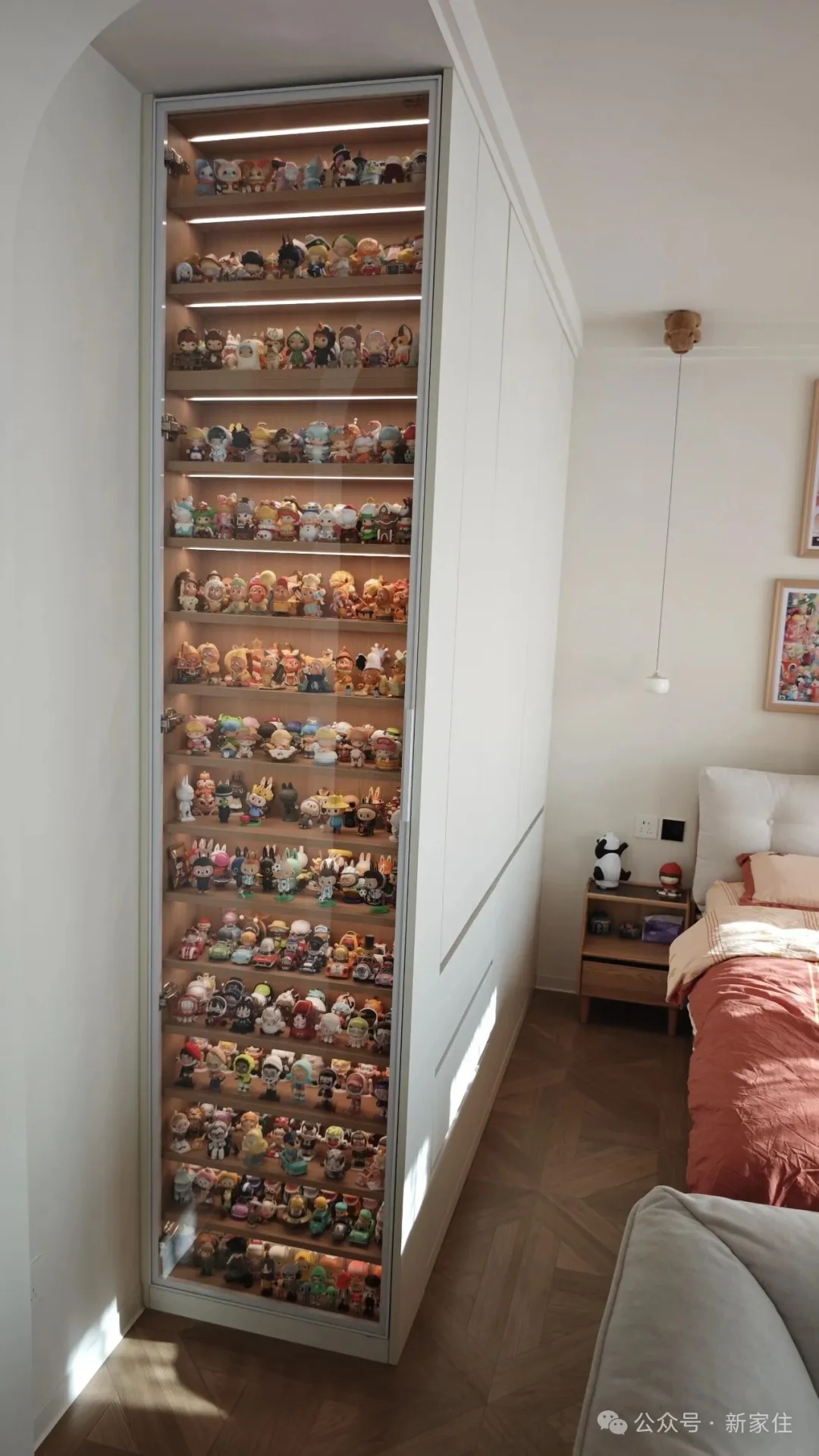 或者也可以做个盲盒柜,放置手办或者装饰品,搭配灯光,这样的卧室展示柜,氛围感满满!